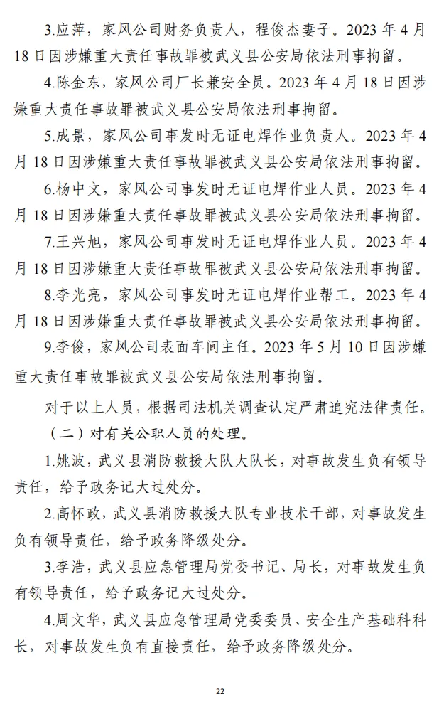 2.程俊杰,家风公司法定代表人,火灾发生单位主要负责人。2023年4月18日因涉嫌重大责任事故罪被武义县公安局依法刑事拘留。