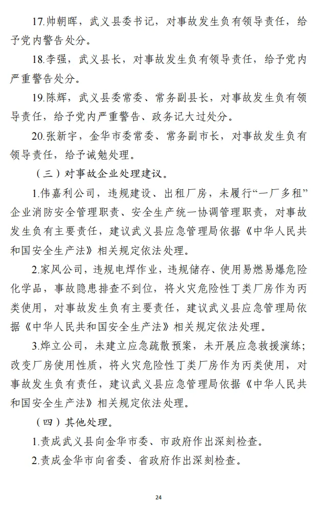 18.李强,武义县长,对事故发生负有领导责任,给予党内严重警告处分。