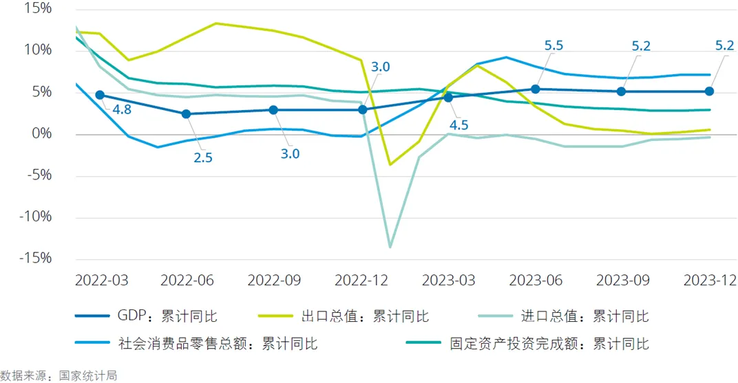 作为三年疫情防控转段后经济恢复发展的第一个完整年度,2023年中国经济整体保持回升向好态势,全年GDP实现5.2%的增长,呈现出消费恢复较快、投资规模继续扩大、外贸总体平稳的特点。消费方面,全年社会消费品零售总额同比增长7.2%,其中,服务消费快速恢复,交通、住宿、餐饮等领域的服务零售额实现20%的增长。投资方面,固定资产投资增长3.0%,其中制造业和基础设施投资分别增长6.5%和5.9%,新动能成长壮大,高技术产业投资增长10.3%,而房地产仍未见企稳,房地产开发投资下降9.6%。外贸方面,全年出口增长0.6%,而进口下降0.3%(以人民币计),考虑到2021年、2022年两年出口规模高基数的影响,出口数据展现了中国外贸较强的韧性和国际竞争力。