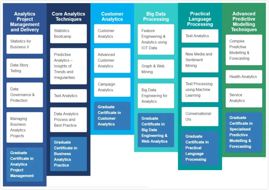 我所就读的项目是企业商业分析,主要学习的课程包括数据管理,统计学,基础算法知识和大数据相关的课程。这个专业设置主要以就业为导向,教授的内容更偏向实际操作,理论推导相对较少,比如如何在特定的场合使用某种大数据组件。我们的期末考试也会更注重每个算法应该结合什么业务场景使用,优缺点在哪里,而不是单纯考一些定义和推导。