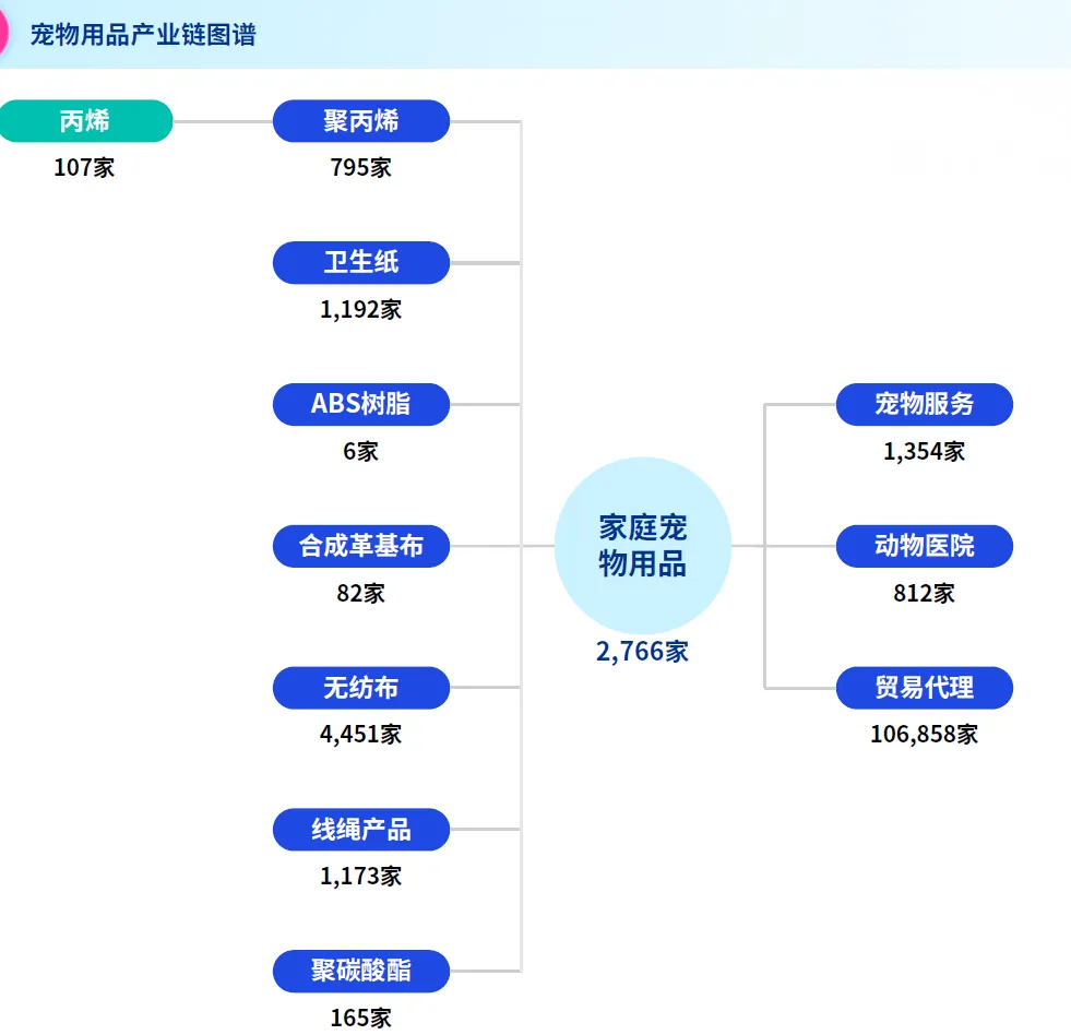 在上游供应链中,供应用于生产宠物清洁用品的卫生纸和无纺布的企业数量最多。
