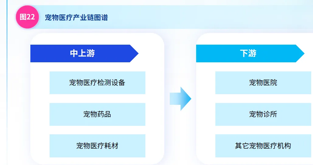 宠物健康产业链由多个环节构成,中上游主要由各种宠物医疗检测设备和医疗器械的生产商以及宠物疫苗和药品、耗材的生产商所构成。宠物医疗机构位于产业链的下游,是直接面向消费者的终端服务提供方。