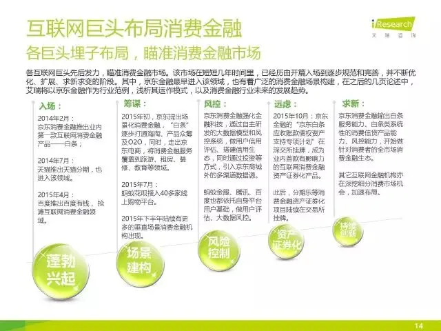 2014年2月,京东金融推出首款面向个人用户互联网消费金融产品——白条。2015年,“白条”全面打通京东体系内的线上消费场景,覆盖了O2O(京东到家)、海淘以及产品众筹,同时,走出京东,进一步覆盖线下消费场景,包括租房、旅游、教育、装修等。在模式上,用于京东商城的“白条”属于赊购服务,用于京东商城外的消费场景的“白条”属于消费贷款。