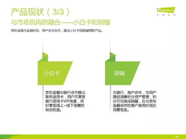 京东金融与金融机构、商户充分合作,推出小白卡和钢镚两款产品。小白卡,京东金融与银行合作推出联名信用卡,用户可享受银行信用卡VIP待遇,同时享受线上+线下消费的组合权益。钢镚,与银行、商户合作,为用户提供消费积分资产管理,积分可兑换成钢蹦,在与京东金融合作的商户使用时抵扣消费现金。