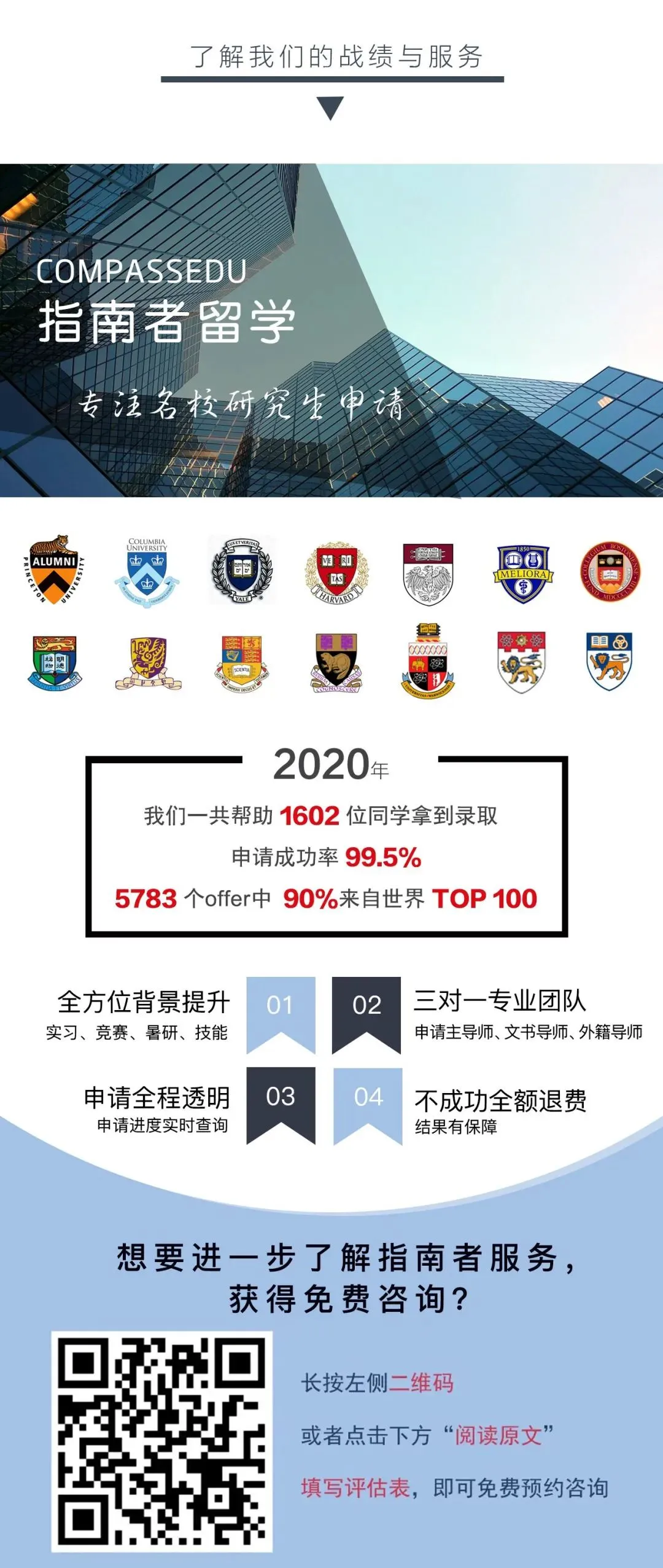 在背景规划方面,指南者老师全程提供指导与监督,我自己自觉性较差,经常做事磨磨蹭蹭,因此有一个能够随时督促我不断完成既定目标的老师简直太重要了!而且,老师的专业经验可以告诉你应该如何去背景提升,让时间精力花在刀刃上。比如,对于我GPA不够高的情况,老师让我把大学几年的成绩单发给她,她来详细地看每门课程的成绩,根据老师以往的案例经验,分析出哪几门课程对于我申请的专业比较重要,从而有针对性地进行提分。经过一年针对性地背景提升,指南者老师结合我各方面情况,对我一年前设定的院校专业组合进行了一系列调整,总体上因为这一年来各项工作都有所落实,因此将一些原本用于保底的专业换成了可以冲一冲的更好的专业,申请列表的整体档次有所上升!在申请材料的准备上,由我初步提供一些科研的经历与申请想法,从而保证内容的个性化。如果自己创作素材实在困难,指南者也会手把手指导完成。像我的个人陈述中有一项未来职业规划,我实在没有太多的了解与想法,写不出有意义的内容,也是指南者的老师在询问我细节的基础上帮助我一步步完成。在推荐信RL的准备上还有一个小插曲,本来我邀请帮我写推荐信的是一位熟悉我的教授,他为人一向十分严谨认真,和我提出了他本人要在中介写好的文书基础上亲自审阅修改后才愿意签字,但是后来他仔细看了指南者的RL文书后,觉得没什么问题,直接贴上了他的电子签名。术业有专攻,专业的事情还是交给专业的人来做,我们可以双线配合,放更多的时间精力在提升背景上。基于我本人的整个申请经历来讲,还有以下几个注意事项分享给大家:① 在大一大二期间,最好尽快确定日后的发展方向,多预约学校里就业指导中心的老师进行沟通,多咨询学长学姐以及相应的信息网站,充分了解保研、考研、留学、就业、考公考教等途径的利弊,反复权衡后作出决定并及早进行相应的准备;② 在留学方面,如果需要寻找留学中介的话,一定要多咨询有亲身体验的学长学姐,一个靠谱的中介绝对是申请的最大助力;③ 雅思托福的语言成绩,不太能靠刷题来进行短期速成,尤其是口语部分,至少需要持续半年时间的科学练习才能有较为明显的提升。可以自己多在视频网站上获取对应的讲解资料与练习模式,找到与自己有共同需求的小伙伴一起每天对话练习。如果急需短期速成,最好还是报班,指南者留学的学员也可以享受免费的语言辅导。如果暂时还没有语言成绩,也可以先递交申请(香港、新加坡地区除外),英美、澳洲等高校都可以发conditional offer,可以边等申请结果边考语言,即使一直没有考出符合要求的语言成绩,也可以先去参加录取学校的语言班;④ GPA实在是太重要了,哪怕大三大四累成狗,也要多刷分!多提高一点也是好的,我自己把三门大学数学都重修了(每门都5学分,占比很大),也怪自己当时大一大二没有认真刷题,只有及格就行的低级追求;⑤ 每个申请的院校专业,最好直接申第一轮!以我自己申请的一些院校专业来看,虽说分成了四五轮申请、发offer,但实际上主要还是前期的批次发放的offer较多,越早递交申请,录取的希望越大,也有充足的时间来考虑后续的事情。同时,在收到学校的录取回复以后,需要及时跟进状态,留心学校的邮件通知。扫描下方二维码