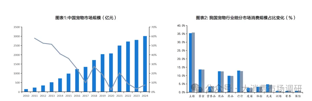 n 宠物行业保持成长性,2024年中国城镇宠物(犬猫)消费市场规模达3002亿元,同比增长7.5%。根据派读《中国宠物行业白皮书》统计数据,2024年国内宠物犬消费市场规模为1557亿元,同比增长4.6%;宠物猫消费市场规模为1445亿元,同比增长10.7%,猫市场增速更高。