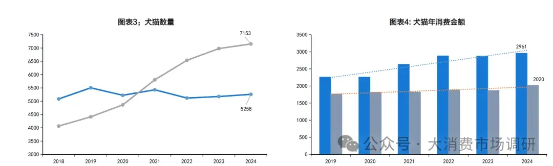 n 犬猫数量呈现上升趋势,猫数量超过犬数量。根据派读《中国宠物行业白皮书》统计数据,2024年宠物犬猫数量1.24亿只,宠物猫的数量是7153万只,宠物犬的数量是5258万只,犬猫数量均有所上涨。从单只宠物的消费能力上看,单只犬的年消费是2961元,同比上升3%,单只猫的年消费则是2020元,同比上升8%。