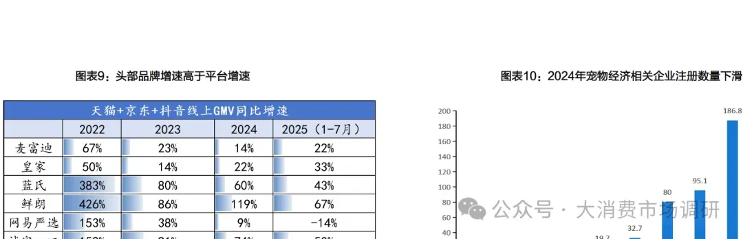 国内宠物市场持续扩容,行业格局分化,头部品牌市占率提升。头部品牌如麦富迪、蓝氏、鲜朗等品牌,近几年线上GMV增速大多都显著高于平台增速,头部品牌的市占率提升。从宠物经济相关企业注册数量看,2024年是十年来宠物经济相关企业注册量首次下降,我们判断头部品牌对腰尾部小品牌已经形成了较大的优势,未来行业集中度将进一步提升。