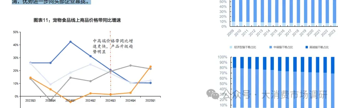 国内宠物市场持续扩容,行业格局分化,产品中高端价格带更具增长潜力。根据派读《中国宠物行业白皮书的数据》,中端价格带产品占比更高;从久谦咨询提供的线上价格带增速看,近期中高端价格带增速更快,产品升级趋势不改,低端产品在增速较低情况下,同质化竞争更激烈,我们认为行业里落后产能会陆续出清,优势进一步向头部企业靠拢。