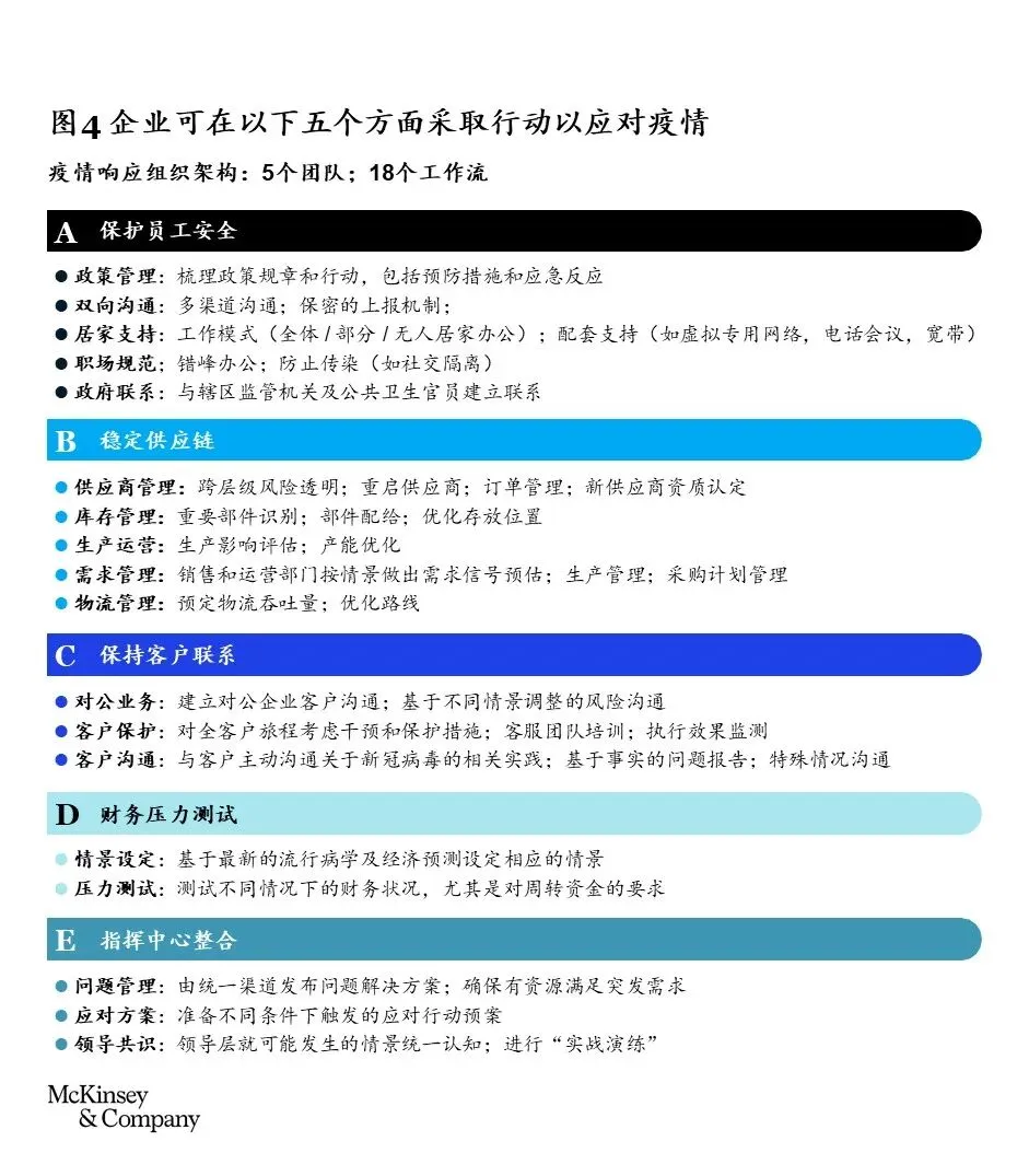 当前马上要落实的举措固然重要。如图4所示,大部分公司都做了大量应对工作。其中许多事情,从长计议尤为重要。经济可能发生衰退。行业结构可能发生改变。信用市场可能失灵,财政刺激也可能收效甚微。供应链的弹性将会产生溢价。这些情景对于每天已经工作18个小时的管理层来说或许难以置信,但是他们需要在百忙之中抽出时间来考虑如何应对长期影响。