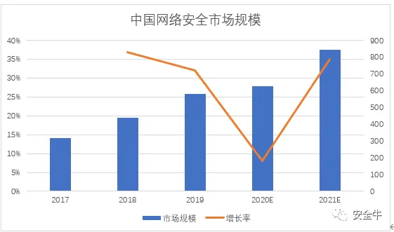 安全牛百强及全景图收集行业信息,基本覆盖网络安全产业企业,以计算企业收入总和加预估未收录企业收入形式,统计各年度安全产业市场规模(跨行业综合性厂商只计算安全类业务收入)。计算得出,2019年国内网络安全总市场规模580亿元,较上年增加32%,2020年受疫情影响市场增量较小,但相对其他行业仍属较快增长,预计增长规模为8%,同样计算从2017年至2020年网络安全市场情况如下图所示。