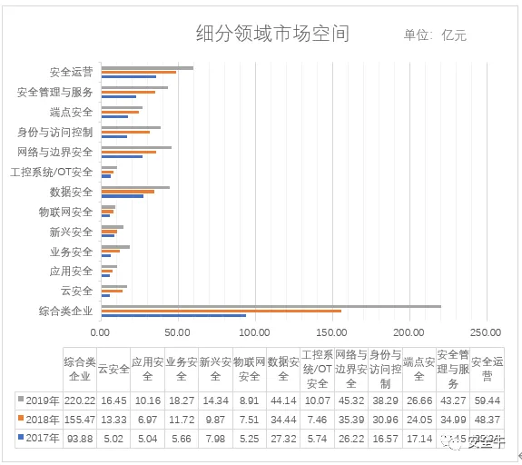 根据安全牛对网络安全领域的产品和服务分类,各安全厂商根据提供产品/服务分为13个子领域,分别为:云安全、应用安全、业务安全、新兴安全、物联网安全、数据安全、工控系统/OT安全、网络与边界安全、身份与访问控制、端点安全、安全管理与服务、安全运营、综合类等。通过统计近3年各领域厂商收入水平,判断行业市场情况如下图所示(部分非综合类厂商有多项业务领域,统计数额有小部分重合):