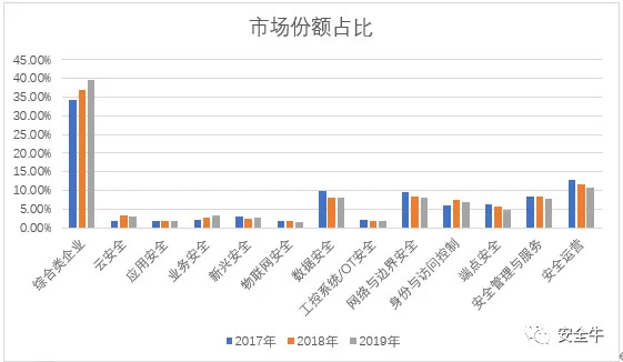 发现2:网络安全产业碎片化特征长期存在,但基于2019年统计数据发现,综合类企业的整体市场占比继续处于上升状态,网络安全领域的集中化趋势开始显现。