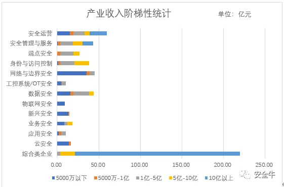 安全牛通过安全行业企业多方面经营数据收集,通过多维度比较分析,得出以下经营指标:安全牛统计2019年各领域企业收入情况,阶梯性统计企业收入,按照收入范围划分5个阶段,由此统计各领域收入的集中情况及整个市场的竞争格局。