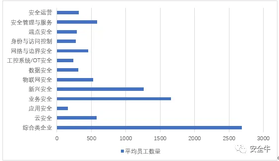 综合类企业普遍为大型厂商,规模通常较大,业务安全和新兴安全领域由于有大中型厂商的参与,平均人员规模也相对较大。而部分领域厂商由于其发展阶段、产品性质等因素,普遍规模不大。