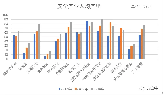 2019年,安全行业平均人均产出为63.82万元,结合近三年来各企业的收入情况,计算各领域的人均产出,可以看出: