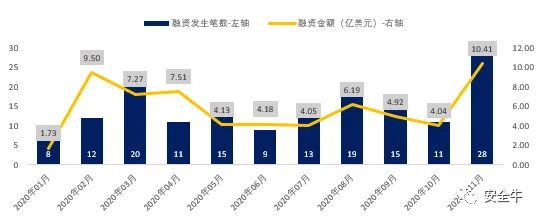 按交易笔数统计:截至2020年11月境外网安市场发生交易笔数前三的分别为,安全管理与服务行业以28起交易位居第一;安全运营和身份与访问控制并列第二,都发生24笔融资交易。