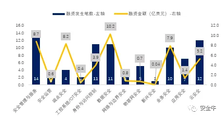 按交易笔数统计:2019年,境外网安市场发生交易笔数前三的分别为,安全管理与服务行业以14起交易位居第一;云安全位列第二,发生了12笔融资;身份访问与控制和数据安全并列第三,都发生了11笔融资。
