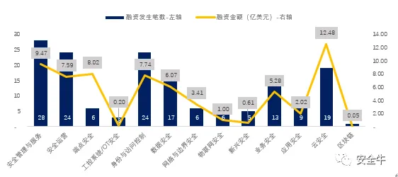 按交易金额统计:截至2020年11月境外网安市场发生交易金额前三的分别为,云安全12.5亿美元,安全管理与服务9.5亿美元,端点安全8.0亿美元。