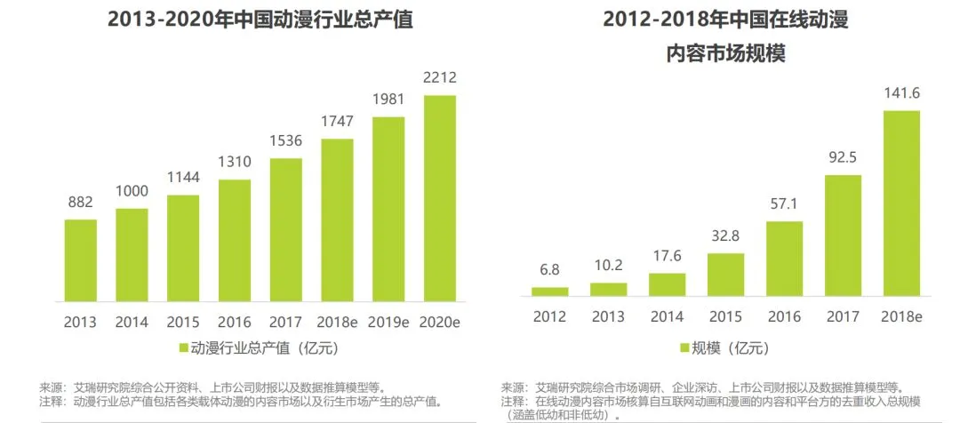 根据艾瑞咨询提供的数据,2017年,中国动漫行业总产值达到1536亿元。并且随着我国近几年非低幼向国产动漫质量和产量的提升,我国在线动漫市场的规模也在快速提升。