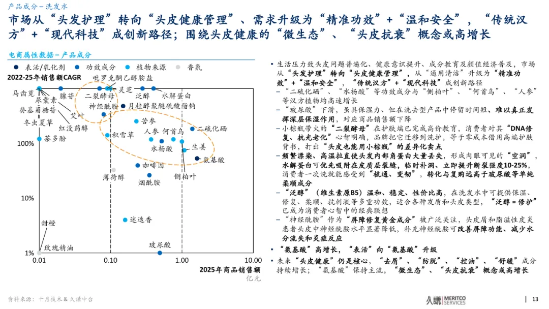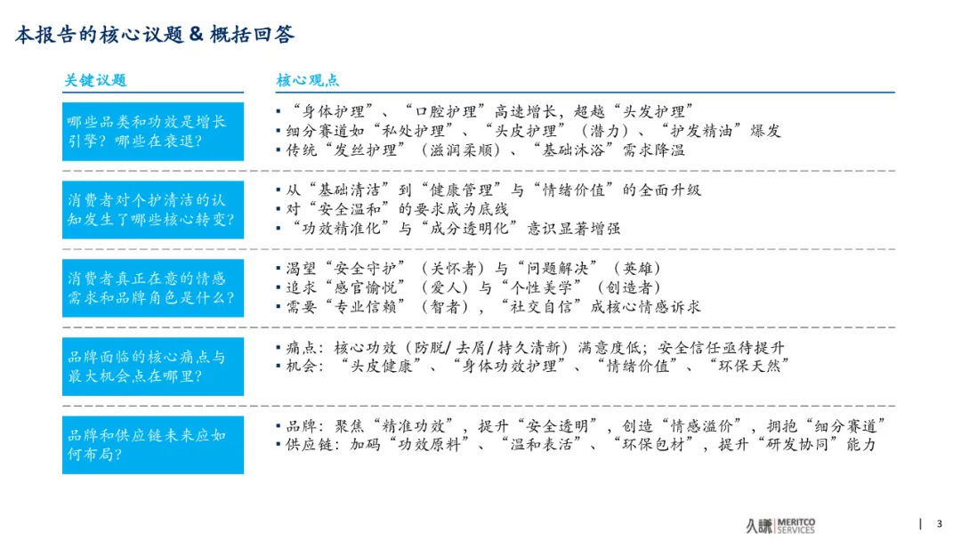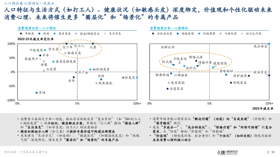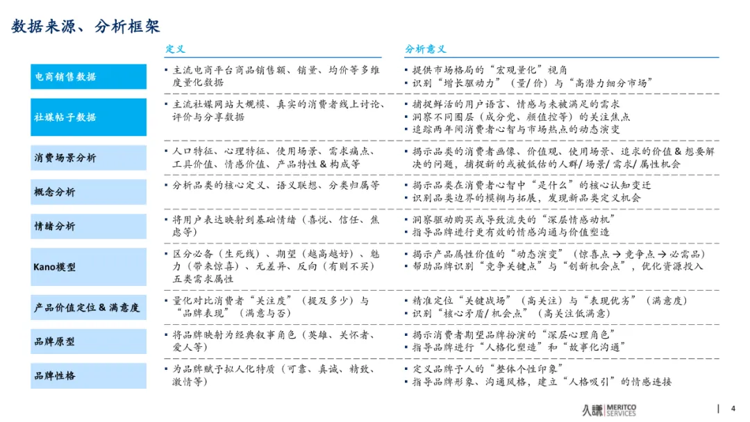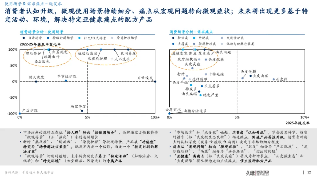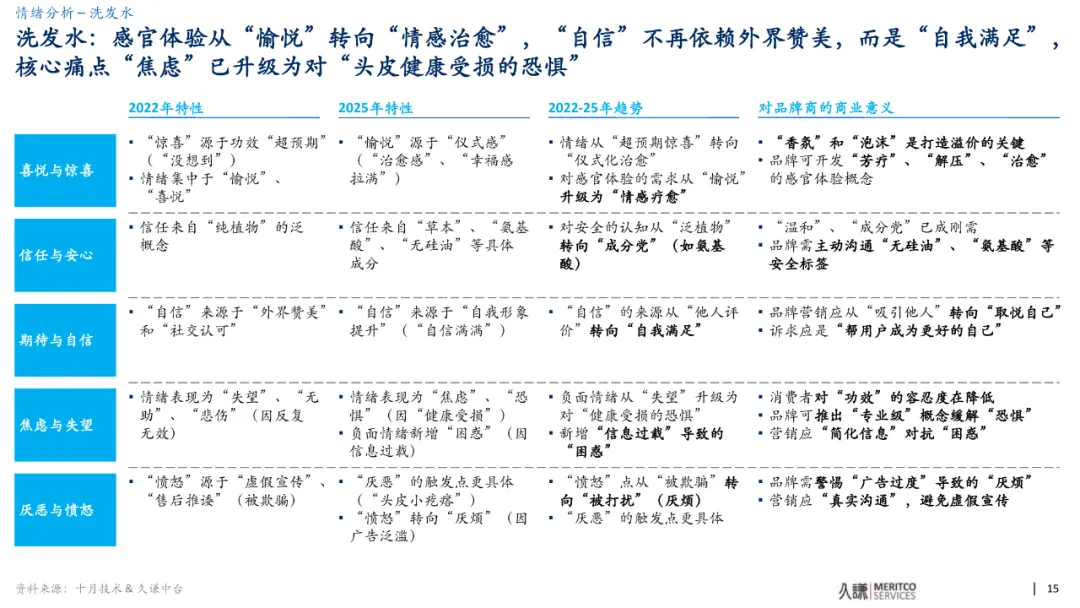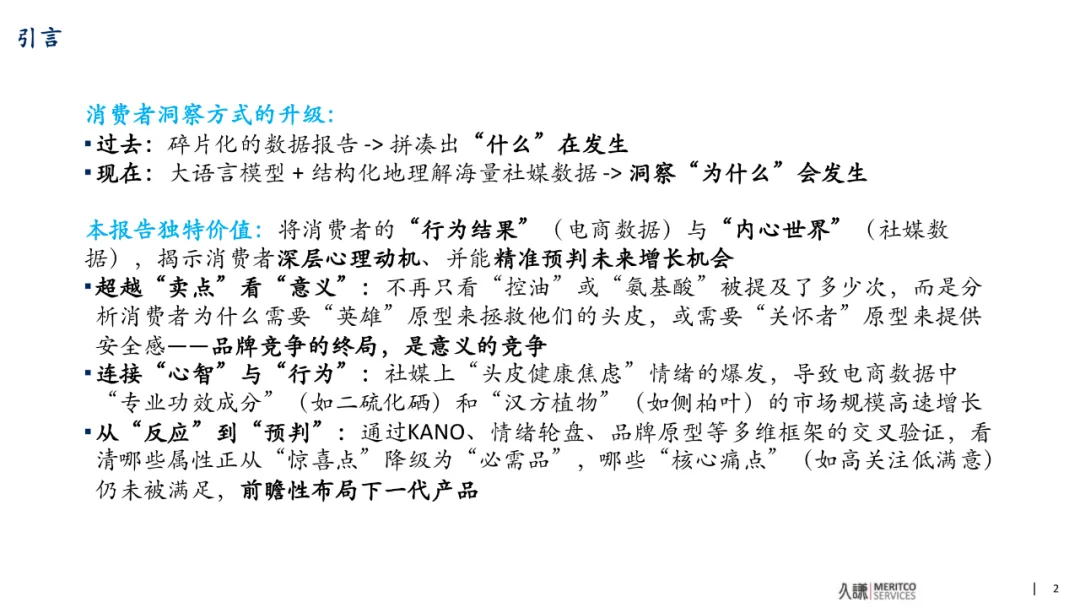 2025年洗护品类趋势与创新洞察聚焦于消费者行为与心理的深度解析,强调通过数据驱动的方式挖掘市场机会。传统数据报告仅能呈现表面现象,而当前借助大语言模型和结构化社媒数据分析,能够揭示消费者行为背后的原因。这种洞察方式将电商销售数据与社交媒体情绪反馈相结合,深入理解消费者内心世界,从而预测未来增长方向。品牌竞争的核心已从产品功能转向意义层面。消费者不再仅仅关注“控油”或“氨基酸”等成分,而是更在意品牌能否满足其心理需求,如对“英雄”原型的依赖或对“关怀者”角色的渴望。社媒上关于“头皮健康焦虑”的讨论推动了“专业功效成分”和“汉方植物”类产品的市场增长。通过KANO模型、情绪轮盘和品牌原型等工具,可识别产品属性的演变趋势,判断哪些功能正从惊喜点转变为必需品,哪些核心问题仍待解决。在品类发展方面,“身体护理”和“口腔护理”持续增长,超越“头发护理”。细分赛道如“私处护理”、“头皮护理”及“护发精油”表现出强劲潜力,而传统“发丝护理”和“基础沐浴”需求有所下降。消费者对个护清洁的认知正在转变,安全温和成为基本要求,功效精准化和成分透明化意识增强。情感需求方面,消费者希望获得“安全守护”、“问题解决”、“感官愉悦”和“个性美学”,品牌需构建“专业信赖”和“社交自信”的情感连接。当前品牌面临的主要挑战在于核心功效(如防脱、去屑)满意度不足,以及安全信任度有待提升。关键机会点包括“头皮健康”、“身体功效护理”、“情绪价值”和“环保天然”。品牌应聚焦精准功效,强化安全与透明,创造情感溢价,并拓展细分赛道。供应链方面,需加强功效原料、温和表活和环保包装的投入,提升研发协同能力。
