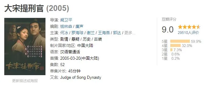 国产剧曾经有过一段辉煌的时期,无论是市场表现、艺术水准还是观众口碑,都取得不俗的体现。/ 《大宋提刑官》保持着9.0的高分