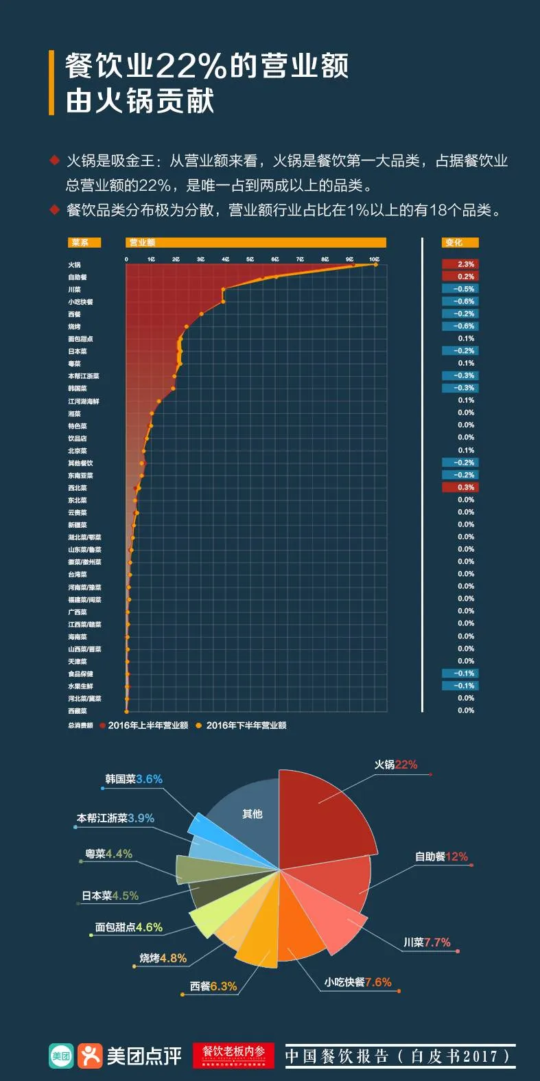 《中国餐饮报告》(白皮书2017)佐证了火锅的国民美食地位——在各个餐饮品类中,火锅店铺数排名第三,但营业额排名第一,22%的餐饮营业额都由火锅贡献,是唯一占到两成以上的品类。(相关阅读:1000万老板关心的舌尖数据都在这里了!)