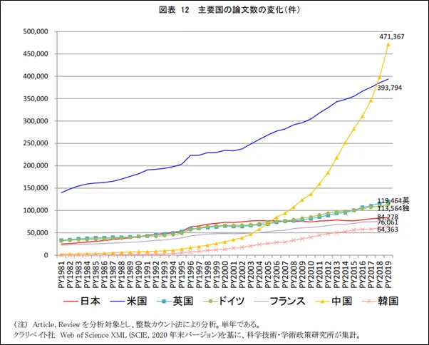 论文数量是衡量一个国家学术研究活跃度的一个基本指标。日本文部科学省下属的科学技术·学术政策研究所根据英国调查公司Clarivate的数据,整理出了世界主要国家论文数量的相关报告。报告指出,中国的学术论文不仅在量,而且在质的方面也力冠群雄。