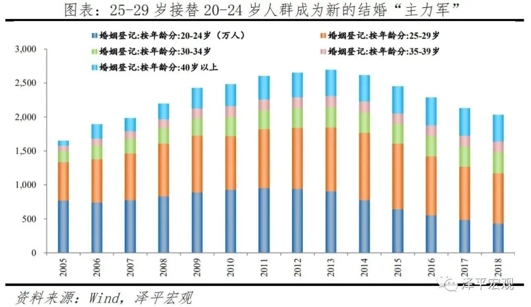 出生率下滑长期影响适婚年龄人数,进而导致结婚对数下滑。根据2010年中国人口普查资料,80后、90后、00后人口分别为2.19亿、1.88亿、1.47亿,90后比80后少约3100万,00后比90后少4100万。当前结婚年龄主力25-29岁(90后)人口大幅下滑,对结婚对数产生负面影响。根据结婚率的计算公式,结婚率=某年结婚对数/某年的平均总人口数×1000‰,分子下滑影响结婚率下滑。