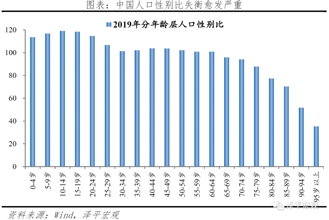 男女比例自计划生育后严重失衡,造成婚姻市场匹配困难,进而影响结婚对数。1982年出生人口性别比(男性:女性,女性=100)为107.6,1990年超过110,2000年接近118,之后长期超过120。根据2010年人口普查资料,00后男女性别比达119,男性比女性多近1300万;90后男女性别比达110,男性比女性多近900万。