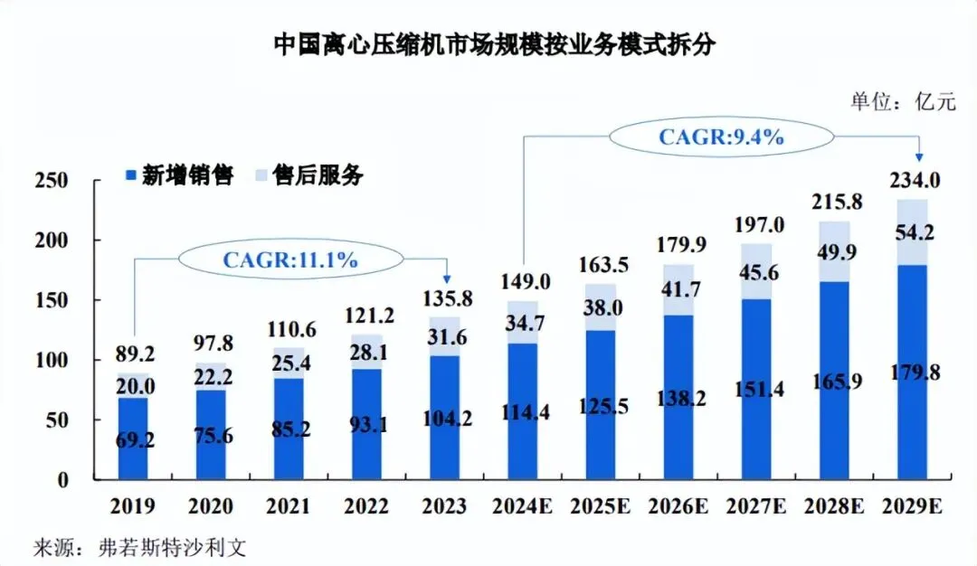 根据弗若斯特沙利文《全球及中国压缩机行业独立市场研究报告》,2023 年中国离心压缩机新增销售市场规模为 104.2 亿元,售后服务市场规模为 34.7 亿元。随着工业规模的不断扩大和技术的持续进步,企业对离心压缩机的长期可靠性和运行效率的要求越来越高,未来中国离心压缩机市场的售后服务需求将持续增长,预计到 2029 年,离心压缩机的售后服务市场规模将达到 54.2亿元。