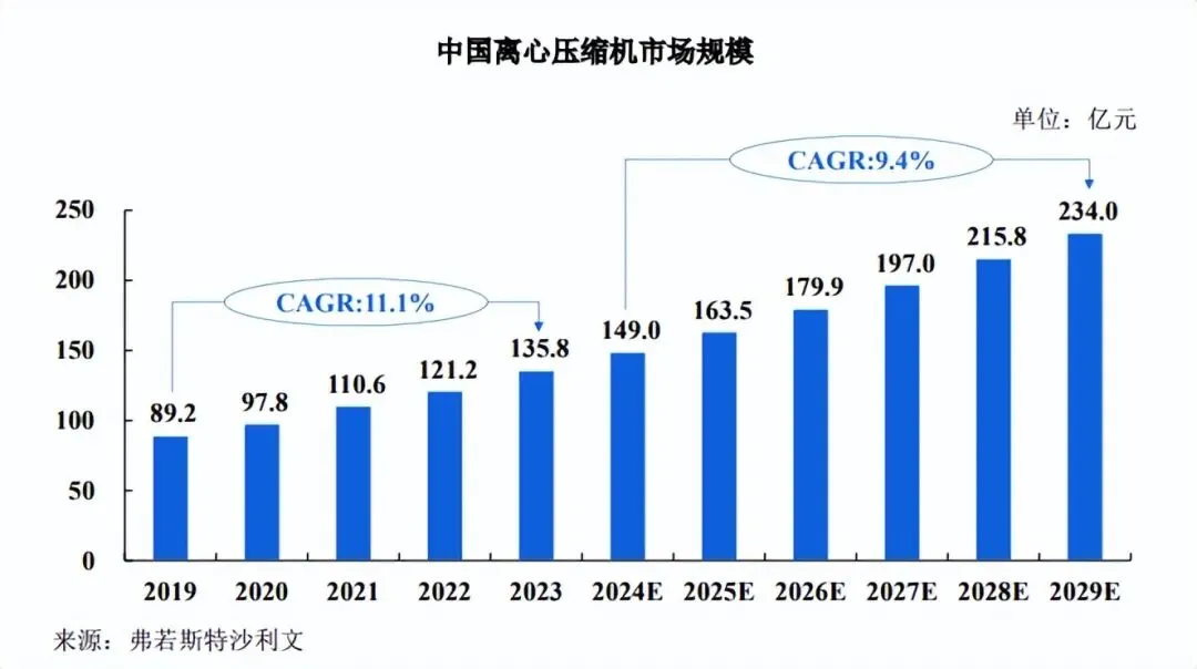 随着全球及国内工业化与能源转型的深入发展,离心压缩机市场需求进一步得到激发。根据弗若斯特沙利文《全球及中国压缩机行业独立市场研究报告》,中国离心压缩机市场规模从 2019 年的 89.2 亿元增长至 2023 年的 135.8 亿元,年复合增长率为11.1%。新兴领域的快速发展为离心压缩机提供了新的应用场景和市场增长点,预计中国离心压缩机市场规模将从 2024 年的 149.0 亿元增至 2029 年的 234.0 亿元,期间的年复合增长率预计将达 9.4%。