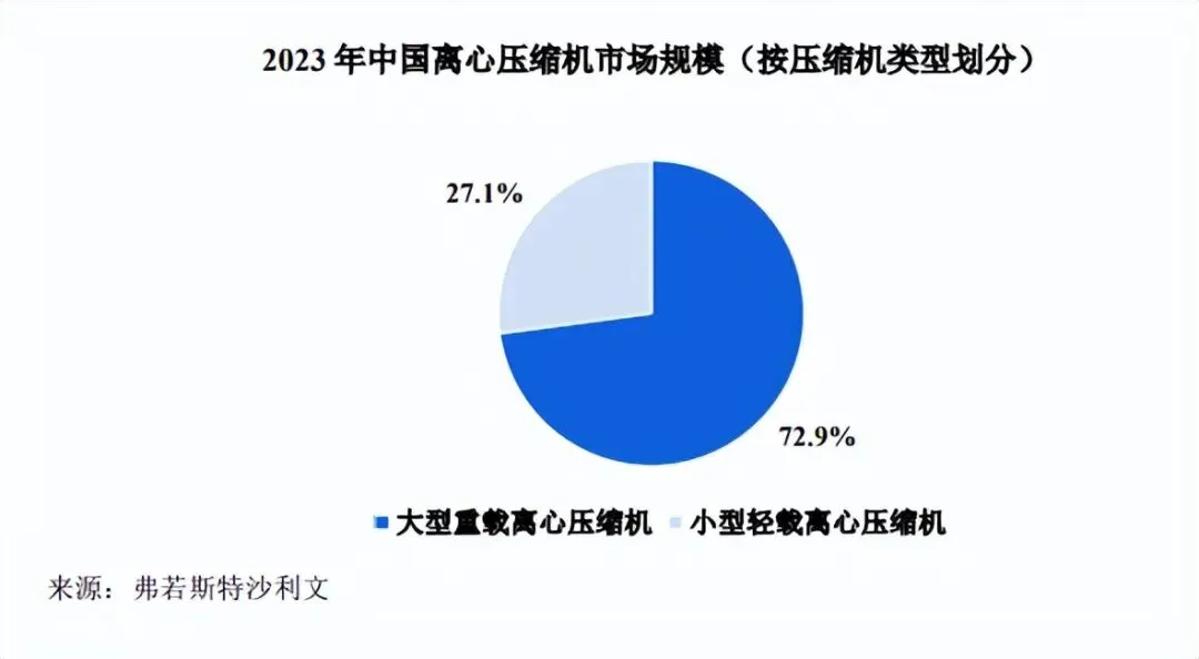 其中,大型重载离心压缩机采用更先进的技术和更复杂的结构设计,通常具有更高的效率和更低的能耗,根据弗若斯特沙利文《全球及中国压缩机行业独立市场研究报告》,2023 年中国离心压缩机市场中,按照年销售金额统计,大型重载离心压缩机占比达到 72.9%,小型轻载离心压缩机占比 27.1%。