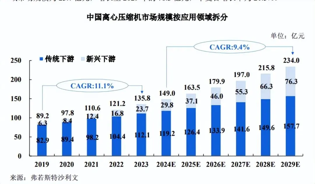 根据弗若斯特沙利文《全球及中国压缩机行业独立市场研究报告》,2023 年中国离心压缩机传统下游应用领域市场规模为 112.1 亿元,预计未来六年以 5.8%的年复合增长率持续增长,到 2029 年达到 157.7 亿元;2023 年中国离心压缩机新兴下游应用领域市场规模为 23.7 亿元,增长至 2029年的 76.3亿元,年复合增长率为 21.5%。