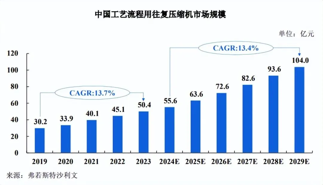 随着国内工业化进程的加速,工艺流程用往复压缩机市场需求呈现出持续增长的趋势,根据弗若斯特沙利文《全球及中国压缩机行业独立市场研究报告》,中国工艺流程用往复压缩机市场规模从 2019 年的 30.2 亿元增长至 2023 年的 50.4 亿元,期间年复合增长率达到 13.7%。随着石油化工、煤化工、天然气化工以及新能源等领域的快速发展,加之国内压缩机制造企业在技术创新方面的持续投入,预计中国工艺流程用往复压缩机市场规模将从 2024 年的 55.6 亿元增至 2029 年的 104.0 亿元,期间年复合增长率预计将达 13.4%。