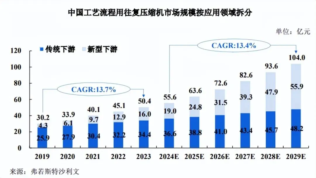 往复压缩机作为工业流程中的关键设备,具有高效、可靠、适应性强等优势,广泛应用于各种气体的压缩和输送环节,在各类传统及新兴下游应用领域都有望迎来积极的发展前景。在石油化工、煤化工、天然气化工等传统领域,往复压缩机的需求主要受工业生产规模和技术升级的驱动。同时,随着全球能源需求的持续增长,对更高效、可靠的设备来确保连续生产和降低运营成本的需求亦持续增强,环境法规的日趋严格亦推动了企业对设备性能、能效和排放控制的要求。根据弗若斯特沙利文《全球及中国压缩机行业独立市场研究报告》,2023 年,中国工艺流程用往复压缩机传统下游应用领域市场规模为 34.4 亿元,预计到 2029 年将增长至 48.2 亿元,年复合增长率为 5.7%。