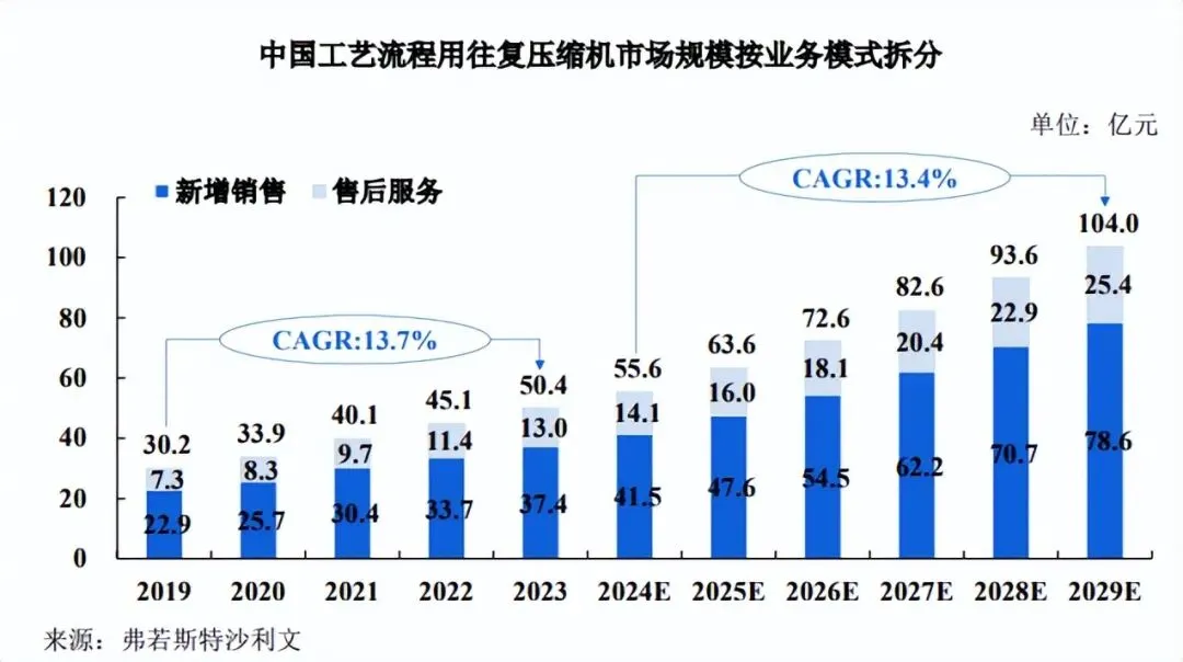 往复压缩机市场规模可以按业务模式拆分为新增销售与售后服务两大部分。新增销售主要来自于工业扩张和新项目的建设需求;售后服务包含设备的改造和备件的替换,涵盖了现有设备的升级、维护与修理等环节。在政策方面,中国政府对节能减排的重视日益增加,出台了一系列环保法规要求企业对现有的往复压缩机进行升级改造,以提高能效和减少排放,促使企业加快对旧设备的改造,采用更高效、更环保的压缩机产品。