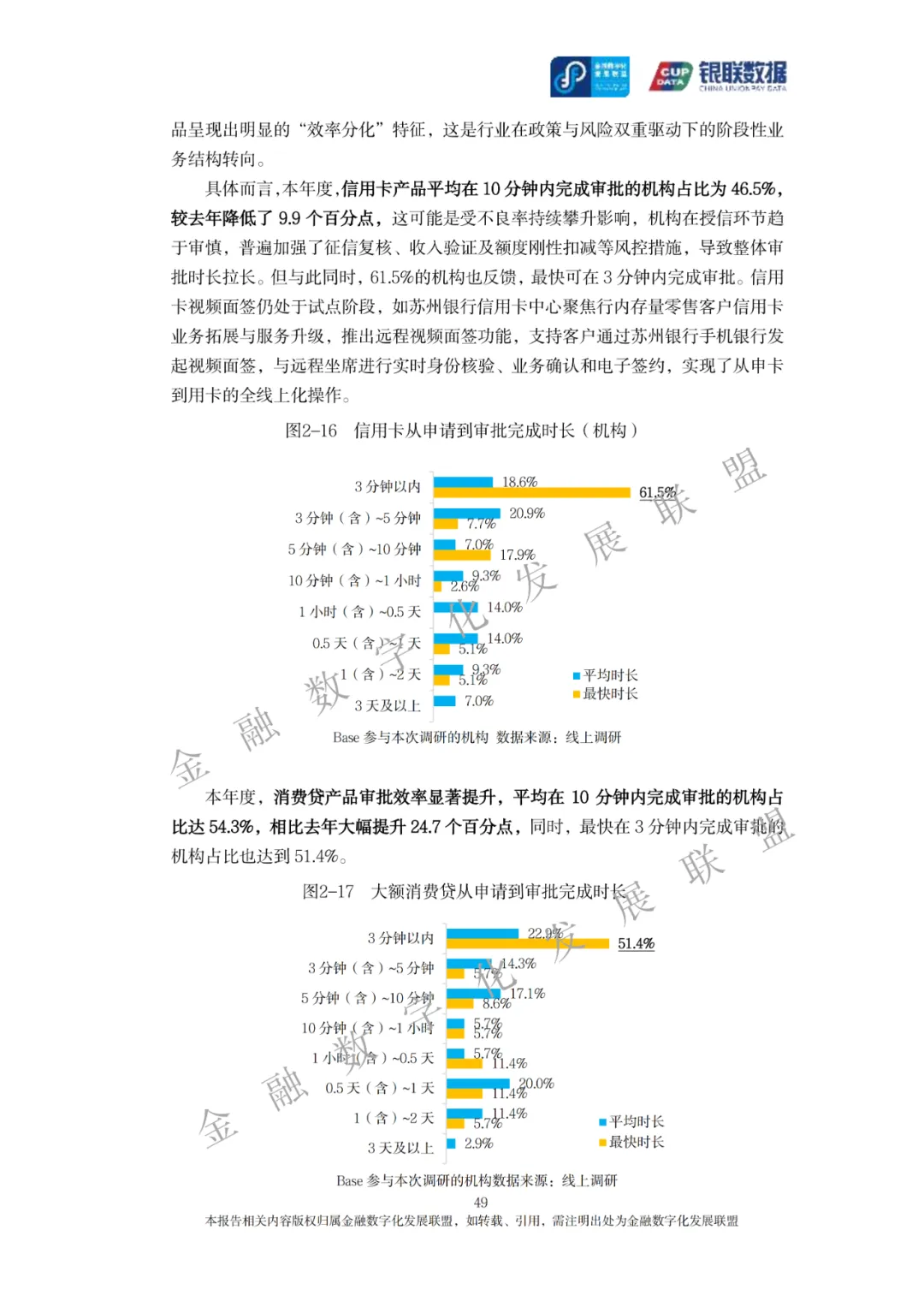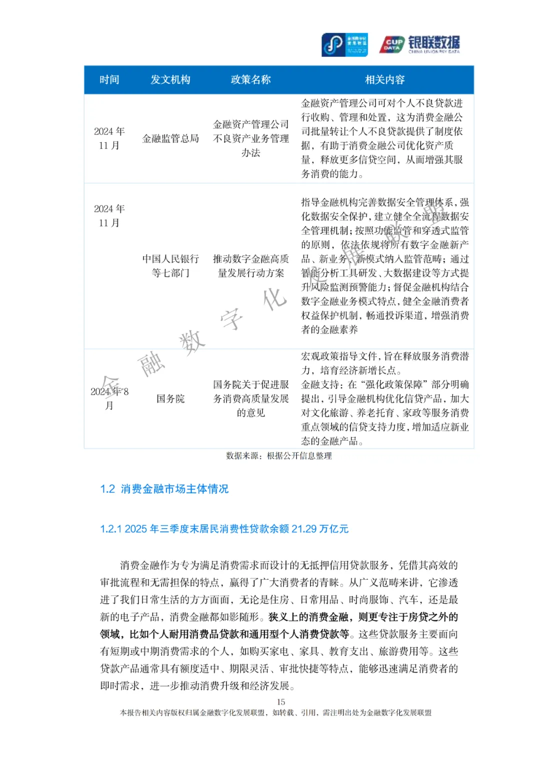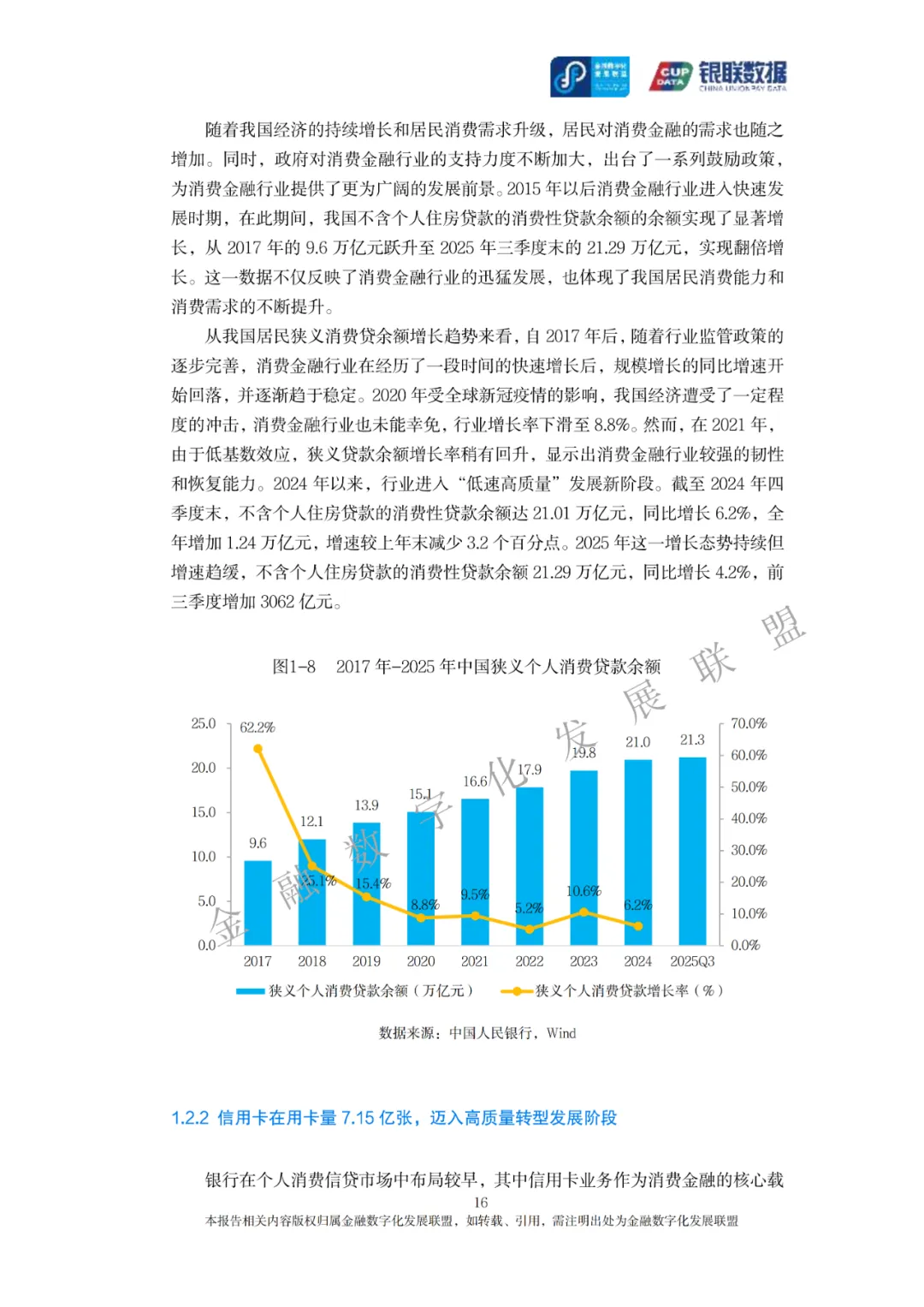 《2025消费金融数字化转型主题调研报告》由银联数据与金融数字化发展联盟联合发布,系统分析了我国消费金融行业在政策引导、市场演变与科技赋能背景下的发展现状与转型趋势。报告显示,2025年消费金融市场规模持续扩大,居民消费性贷款余额达21.29万亿元,信用卡在用卡量7.15亿张,持牌消费金融公司贷款余额1.35万亿元,行业整体迈入“低速高质量”发展阶段。在数字化转型方面,超九成机构已开展数字化重点项目,大模型与AI应用成为年度亮点,尤其在智能风控、精准营销与客户服务等环节成效显著。用户调研揭示,信用卡仍是居民日常消费主力工具,用户推荐意愿高于类信用卡产品11个百分点,但用户体验仍存在申请流程繁琐、权益规则复杂、智能客服不完善等痛点。报告建议机构聚焦客户体验优化、产品权益简化、利率市场化定价以及零售业务融合,以数字化驱动经营能力提升,构建差异化竞争壁垒。