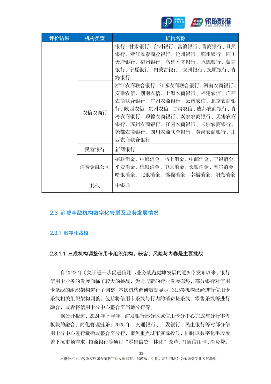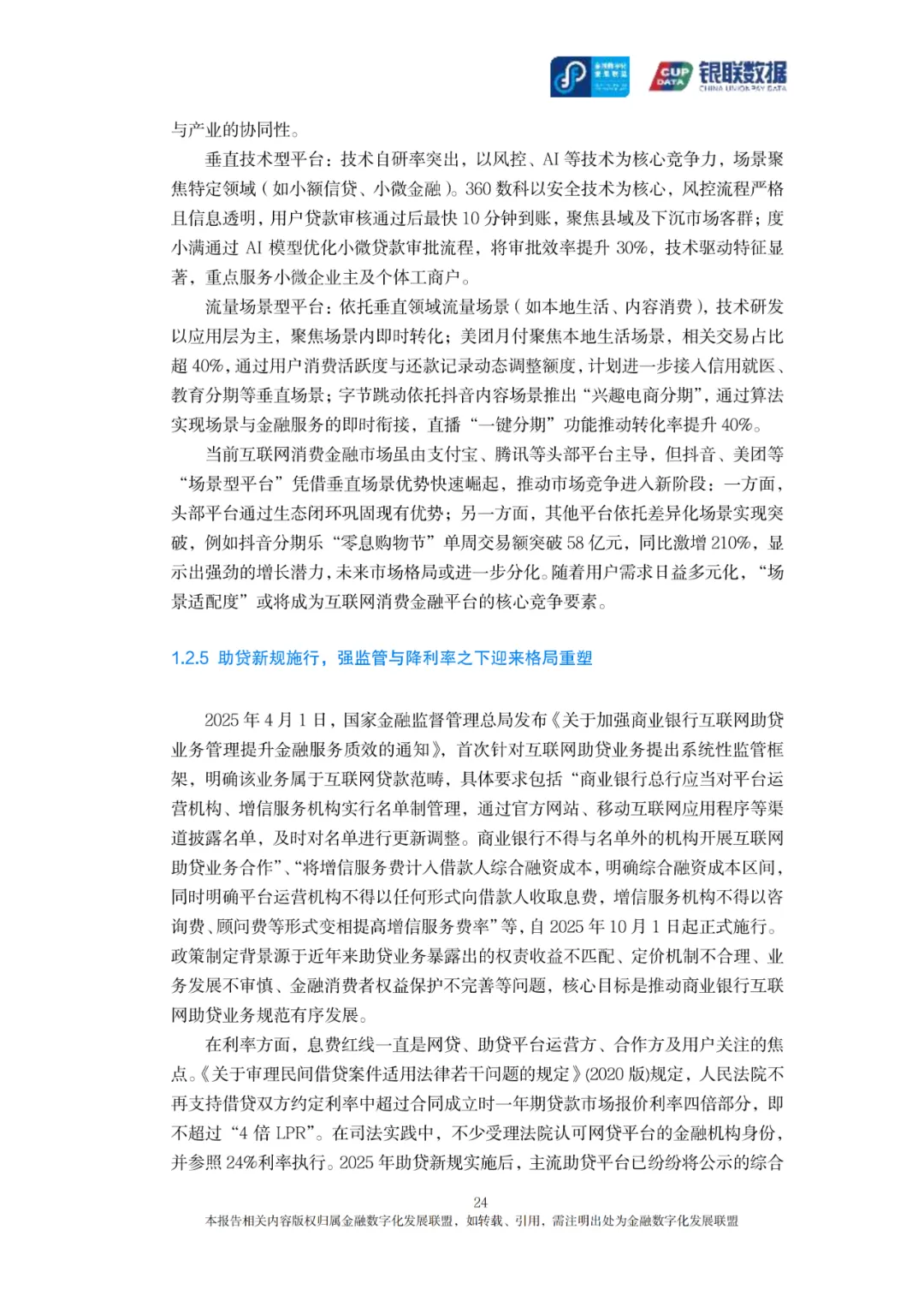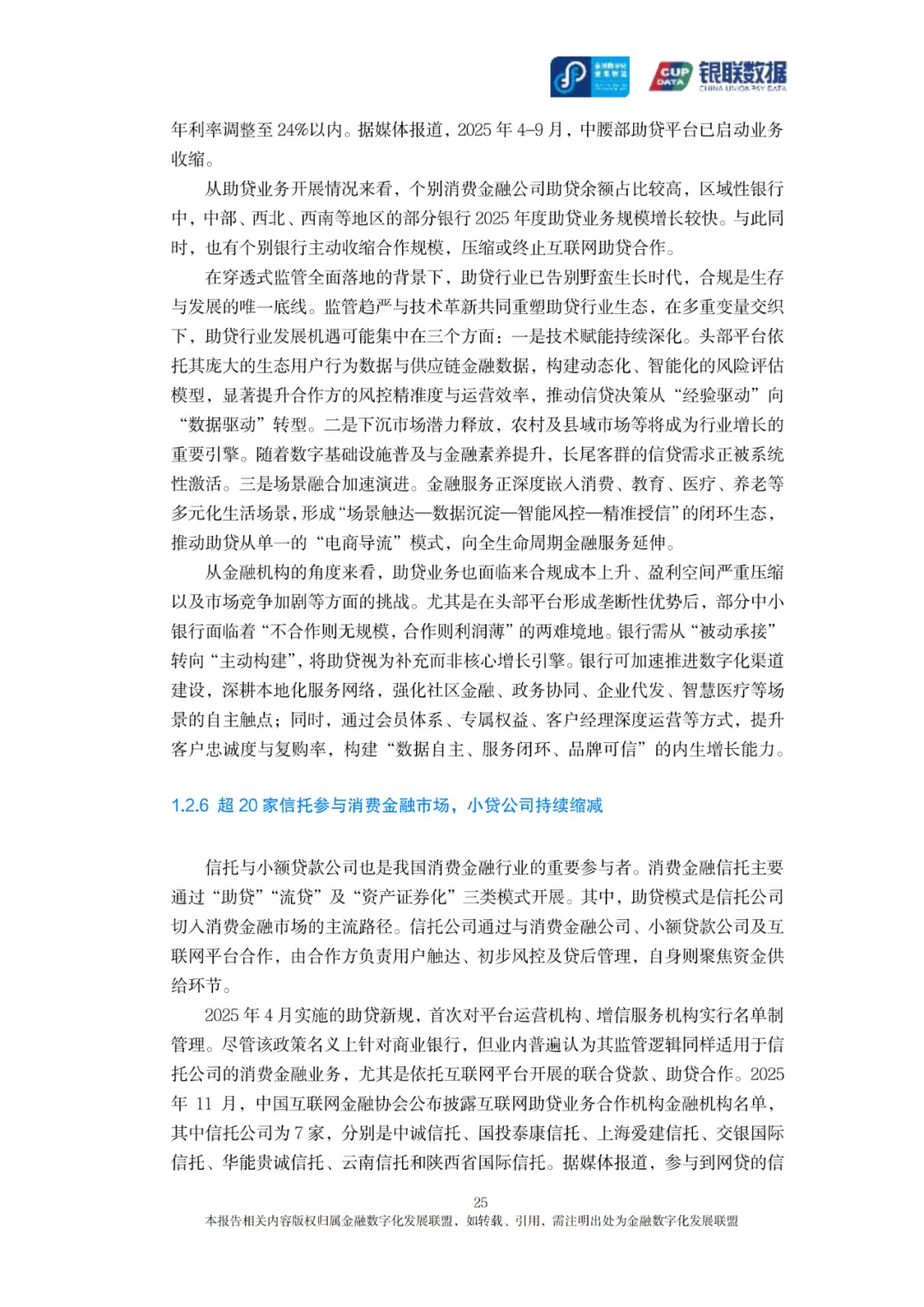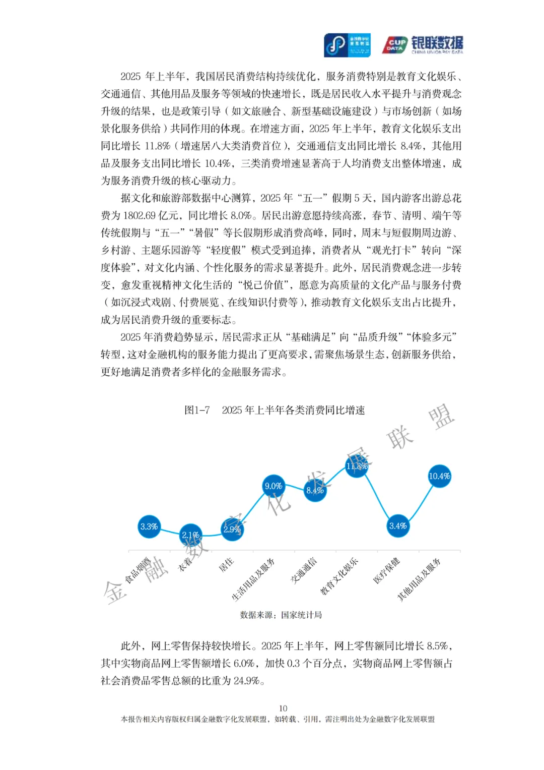 《2025消费金融数字化转型主题调研报告》由银联数据与金融数字化发展联盟联合发布,系统分析了我国消费金融行业在政策引导、市场演变与科技赋能背景下的发展现状与转型趋势。报告显示,2025年消费金融市场规模持续扩大,居民消费性贷款余额达21.29万亿元,信用卡在用卡量7.15亿张,持牌消费金融公司贷款余额1.35万亿元,行业整体迈入“低速高质量”发展阶段。在数字化转型方面,超九成机构已开展数字化重点项目,大模型与AI应用成为年度亮点,尤其在智能风控、精准营销与客户服务等环节成效显著。用户调研揭示,信用卡仍是居民日常消费主力工具,用户推荐意愿高于类信用卡产品11个百分点,但用户体验仍存在申请流程繁琐、权益规则复杂、智能客服不完善等痛点。报告建议机构聚焦客户体验优化、产品权益简化、利率市场化定价以及零售业务融合,以数字化驱动经营能力提升,构建差异化竞争壁垒。