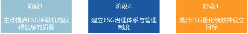 商道咨询总结了上市公司ESG评级提升的三阶段模型:一是开展高质量ESG信息披露并主动进行反馈沟通,提升信息的可获得性和准确性;二是建立自上而下的ESG治理体系,完善公司ESG管理制度;三是提升ESG量化绩效并设立目标,持续提升公司的ESG管理实践定性成果和ESG管理绩效定量结果。