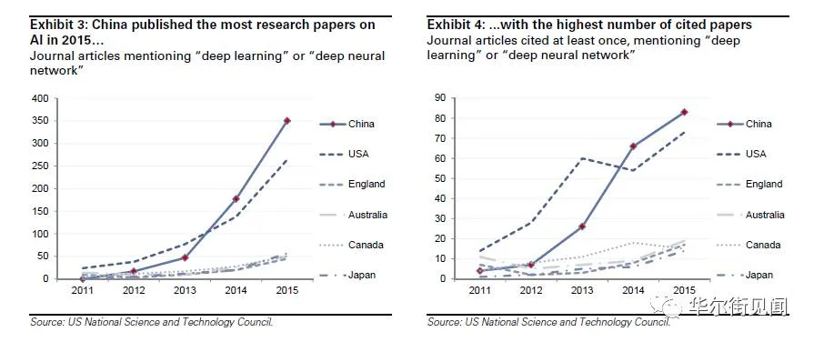 李开复在2017年世界经济论坛年会上指出,2015年全球发表的顶级AI论文中,有43%的论文作者里有一名及一名以上的中国研究人员。如果按照被引用期刊的数量来计算,那么2014年中国已经超越了美国。