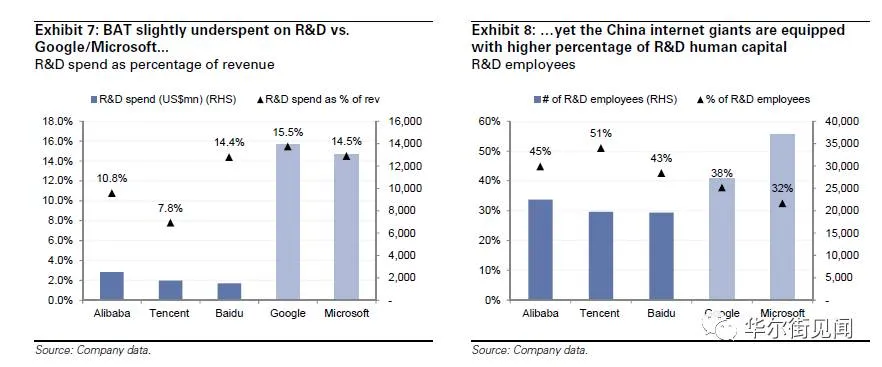 从人力资源比较,BAT也已经可以比肩硅谷巨头。腾讯研发人员的比例达到51%,位居首位,阿里巴巴和百度紧随其后,分别为45%和43%,均高于谷歌(38%)和微软(32%)。