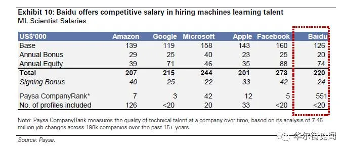 据高盛统计,与亚马逊、谷歌、微软、苹果和Facebook相比,百度为机器学习(Machine Learning )科学家提供的基本年薪为12.6万美元,仅位列六家企业中第五位。Facbook凭借16万美元的年薪位居第一。