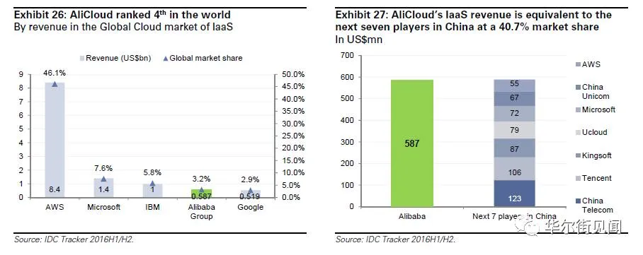 目前,全球IaaS云市场中,按照营收计算,亚马逊的AWS凭借46.1%的份额高居首位,阿里巴巴则以3.2%的市场份额占据第四的位置。