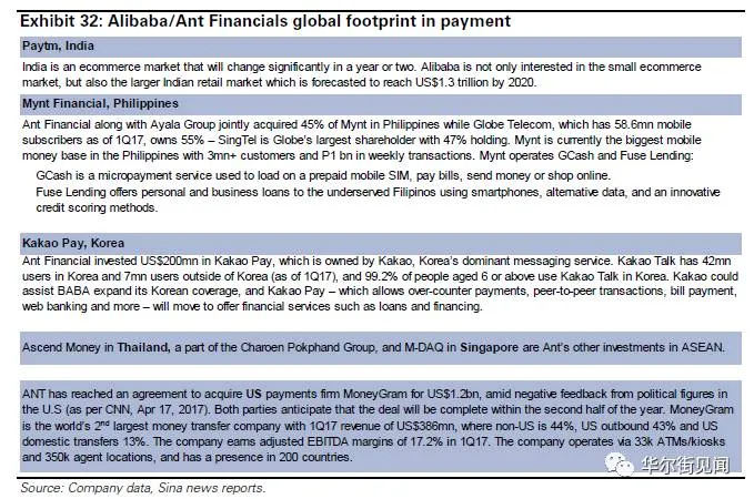 高盛十分看好阿里旗下的蚂蚁金服,认为蚂蚁金服将成长为全球最大的金融科技公司。目前,蚂蚁金服覆盖了全球32亿的人口,付款数据覆盖了7.17亿消费者,其中包括4.54亿的中国在线消费者,以及1.8亿印度使用Paytem的人口。