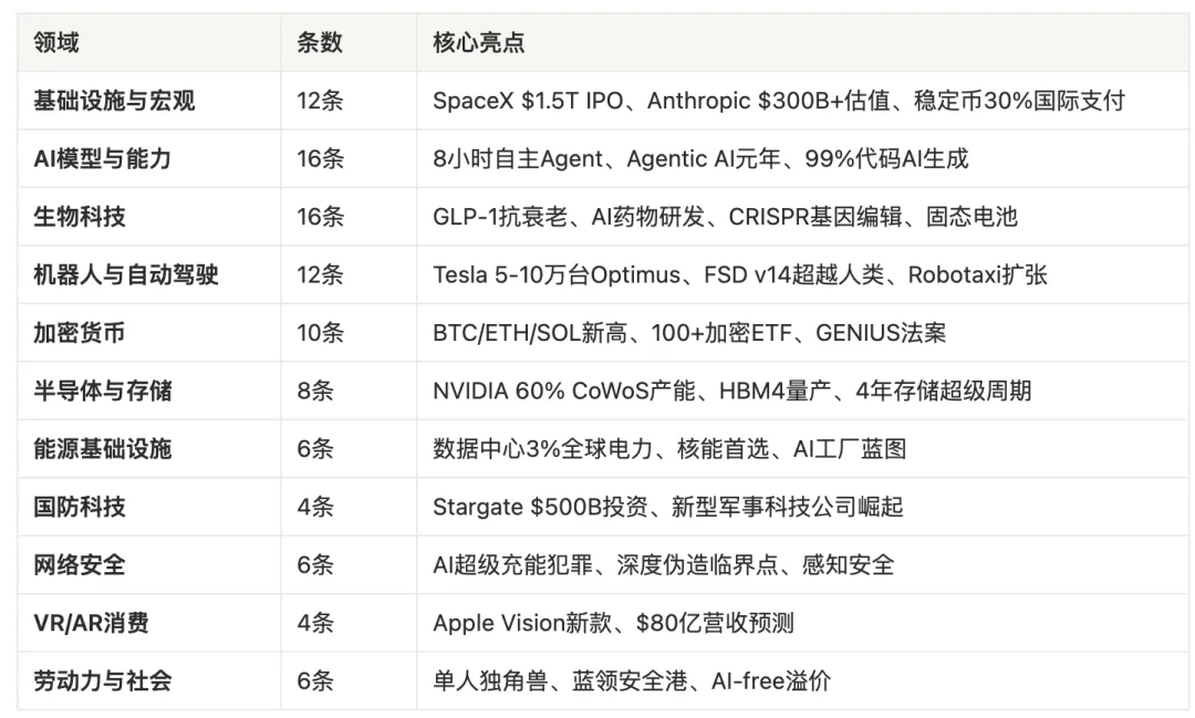 X 上有不少大咖和机构输出了对于 2026 的预测,我让  Claude 帮我整理出了最重要的 100 条,集中在基础设施、AI、 生物科技、机器人Robotics与自动驾驶、加密货币和Web3、半导体、 能源、国防科技、网络安全、VR/AR与消费、劳动力与社区这 11 大领域,欢迎阅读