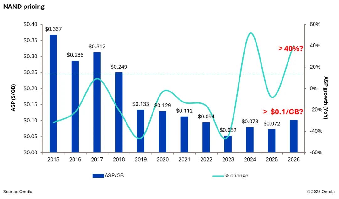 NAND价格历来呈现剧烈的周期性波动。2017年达到峰值后,因供应过剩和需求疲软,价格持续下跌至2022年,并于2023年跌至多年低点。2024年的反弹是自2017年以来最强劲的复苏,由供应商削减产能利用率、库存正常化及CSP(云服务提供商)需求激增驱动。鉴于当前处于低位起点且供应条件趋紧,这一上涨趋势将明确延续至2026年。