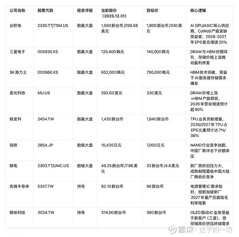•台积电:目标价基于20倍前瞻PE(较SOX指数折价20%),考虑其在AI供应链中的不可替代性及20%的EPS复合增速,估值具备安全边际。