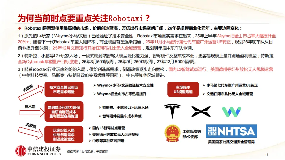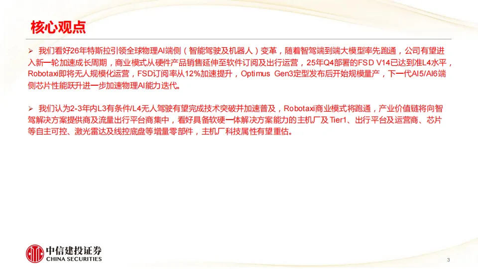 我们看好2026年特斯拉引领全球物理AI端侧(智能驾驶及机器人)变革,随着智驾端到端大模型率先跑通,公司有望进入新一轮加速成长周期,商业模式从硬件产品销售延伸至软件订阅及出行运营,2025年Q4部署的FSD V14已达到准L4水平,Robotaxi即将无人规模化运营,FSD订阅率从12%加速提升,Optimus Gen3定型发布后开始规模量产,下一代AI5/AI6端侧芯片性能跃升进一步加速物理AI能力迭代。
