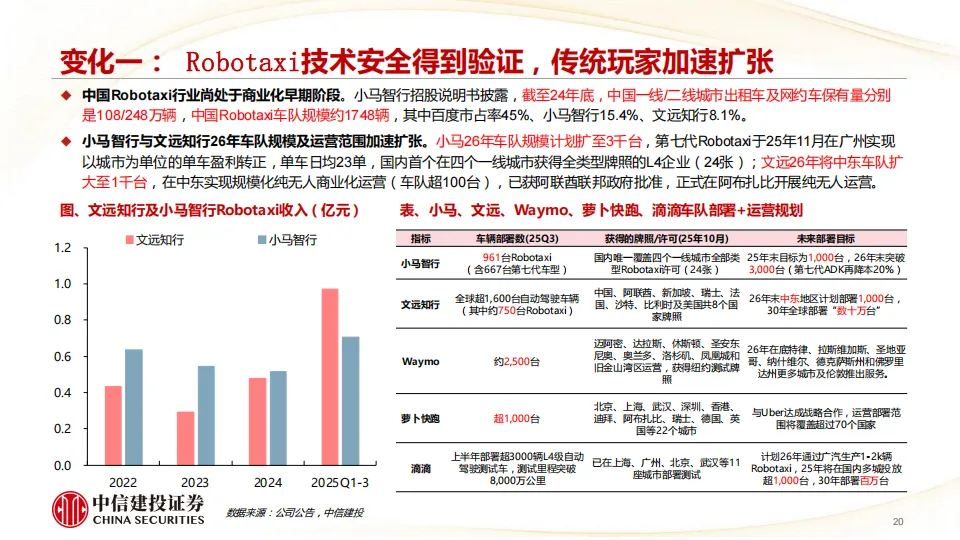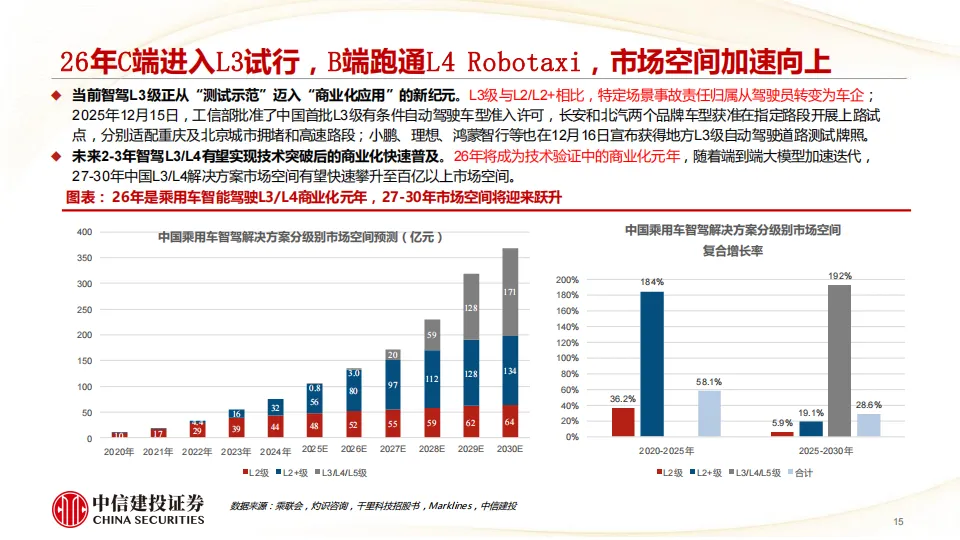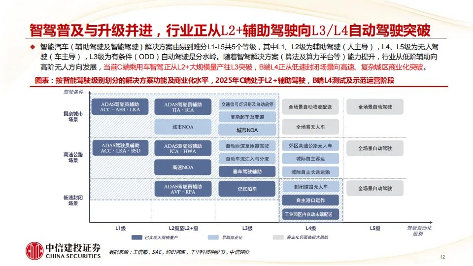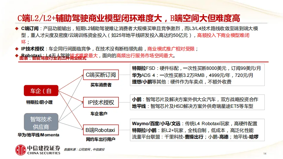 我们认为2-3年内L3有条件/L4无人驾驶有望完成技术突破并加速普及,Robotaxi商业模式将跑通,产业价值链将向智驾解决方案提供商及流量出行平台商集中,看好具备软硬一体解决方案能力的主机厂及Tier1、出行平台及运营商、芯片等自主可控、激光雷达及线控底盘等增量零部件,主机厂科技属性有望重估。
